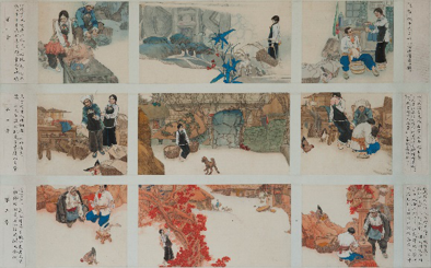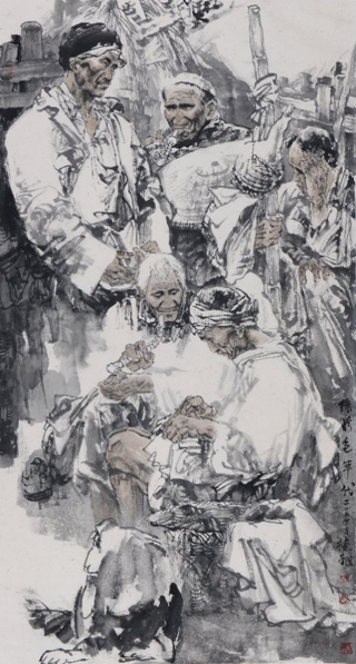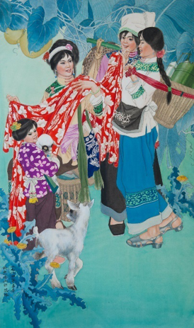 6.作品《五指山系列》,以表现海南黎族生活的大型系列组画,分别为黎族五个支系的生产、生活面貌。其中的《五指山系列·织锦图》两幅巨制,一幅高180cm,长485cm,第二幅180cm,长1000cm,五十多人,涵盖了黎族五个支系的妇女从事黎族织锦的纺、染、织、绣四大工艺劳动。五指山系列作品在各地展出时,被评论界评论为具有民族学和社会学价值;